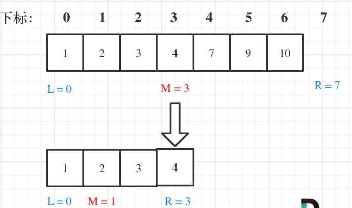 例如在数组:1,2,3,4,7,9,10中查找元素2,如图所示: