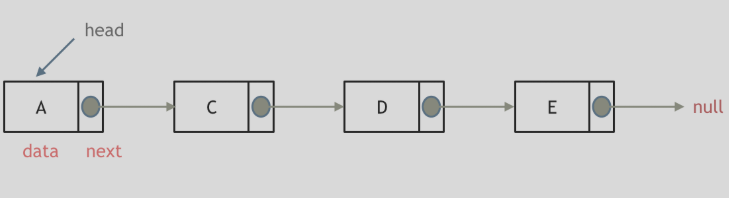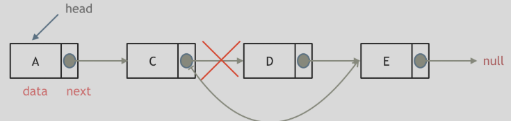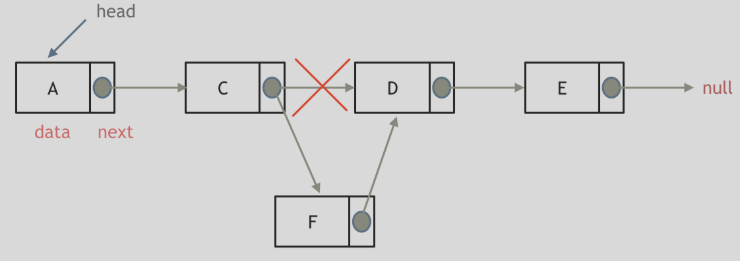 删除D节点:只需把C节点的指针域指向E节点,再释放D节点(Java、Python,就有自己的内存回收机制,就不用自己手动释放了。)