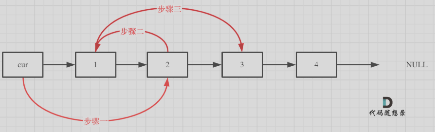#这里用临时变量存储下一个节点,因为第二个节点指向第一个节点的时候,第一个节点与虚拟头节点的next关系变了