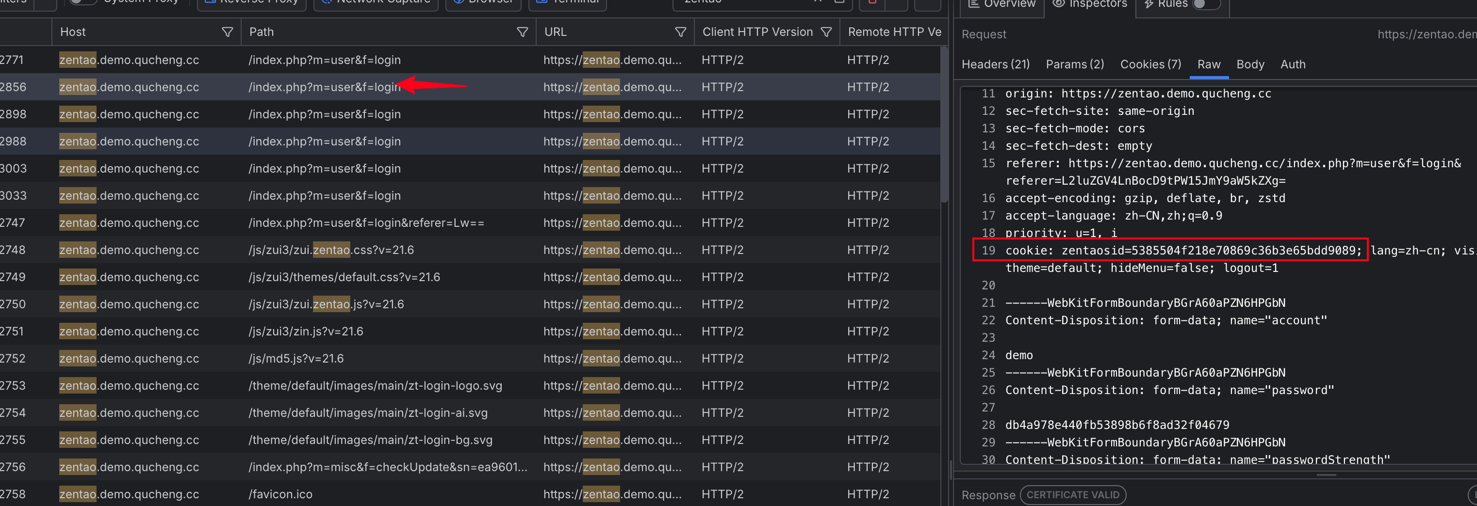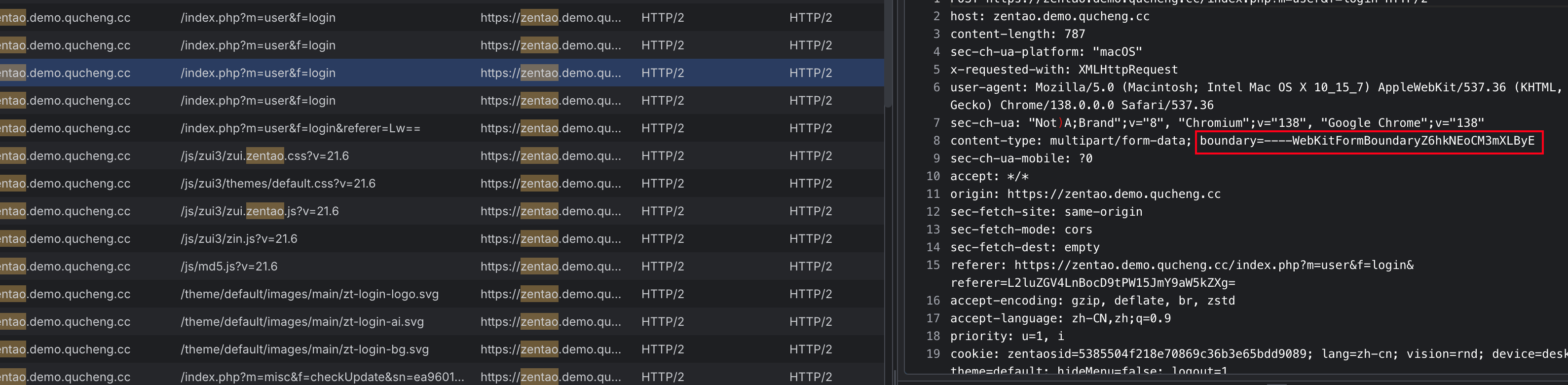 该禅道示例地址的 content-type 会多了一个boundary的随机值,这个字段传少了依旧访问不了