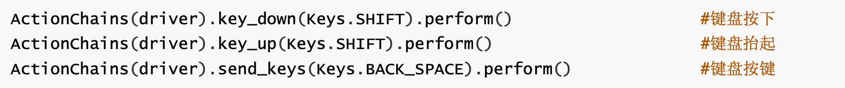 ActionChains(driver).send_keys(Keys.BACK_SPACE).perform() #模拟键盘按键2.键盘按下与松开
