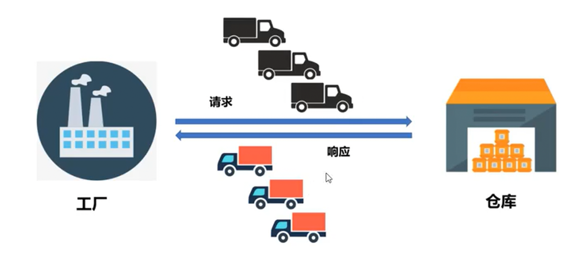 工厂向仓库派遣卡车,拉取货物后返回工厂,这个就是客户端向服务端发起请求,服务端返回响应数据。